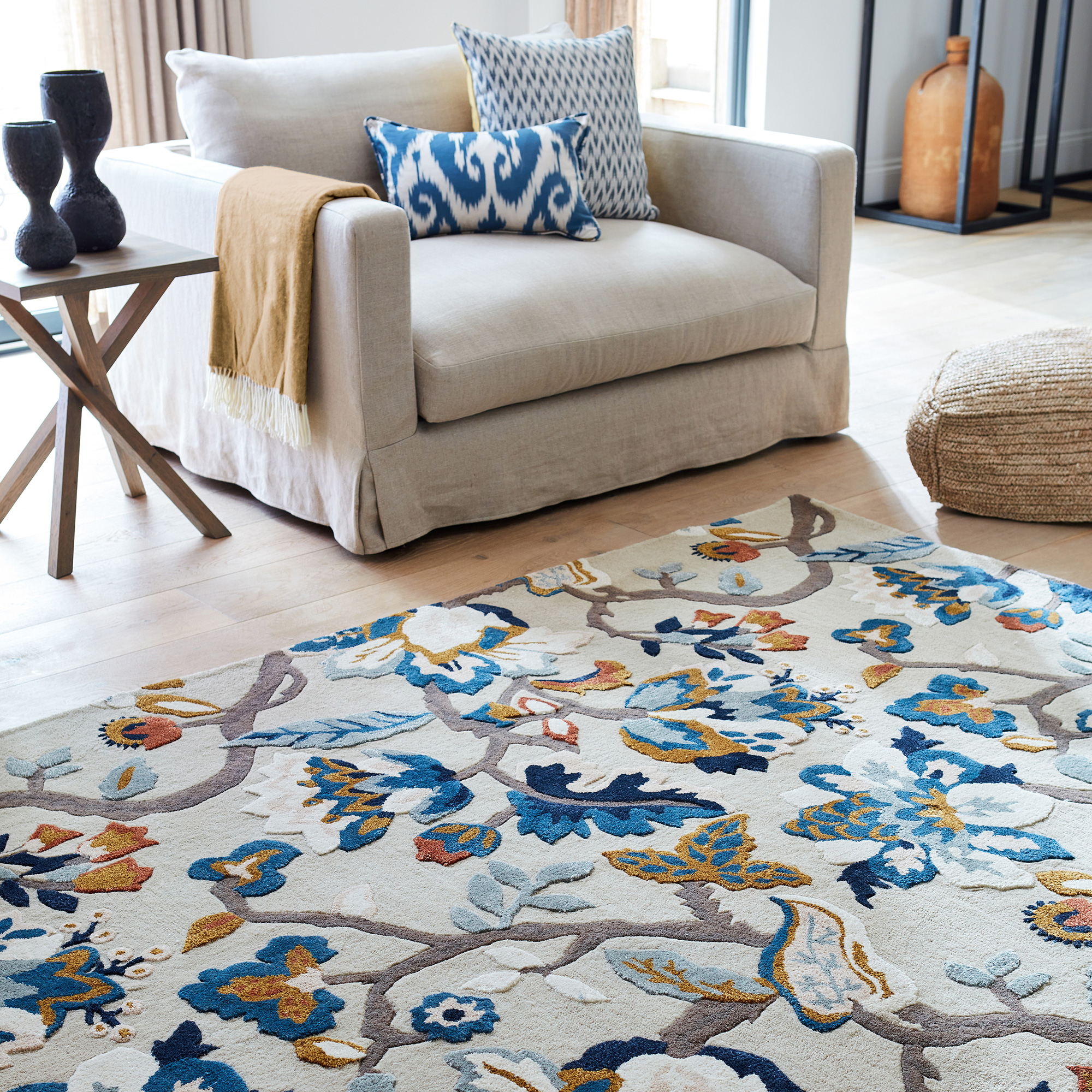 Ses collections d'objets pour la maison - d'un style typiquement anglais - incluent une belle gamme de tapis tuftés à la main en laine véritable et aux designs les plus iconiques de la maison Sanderson.