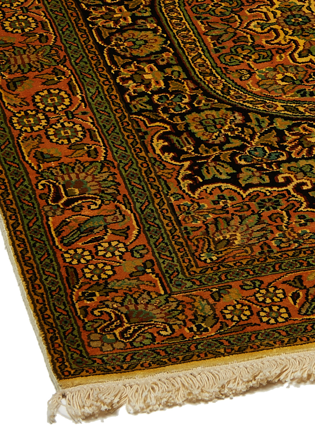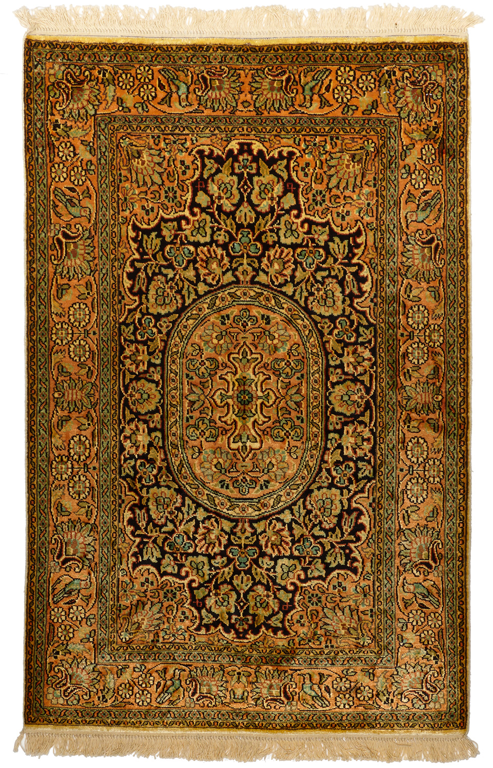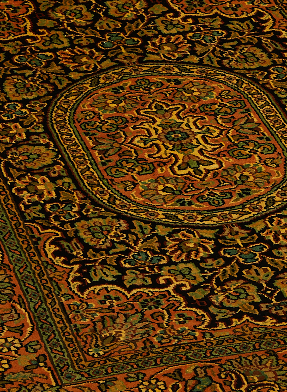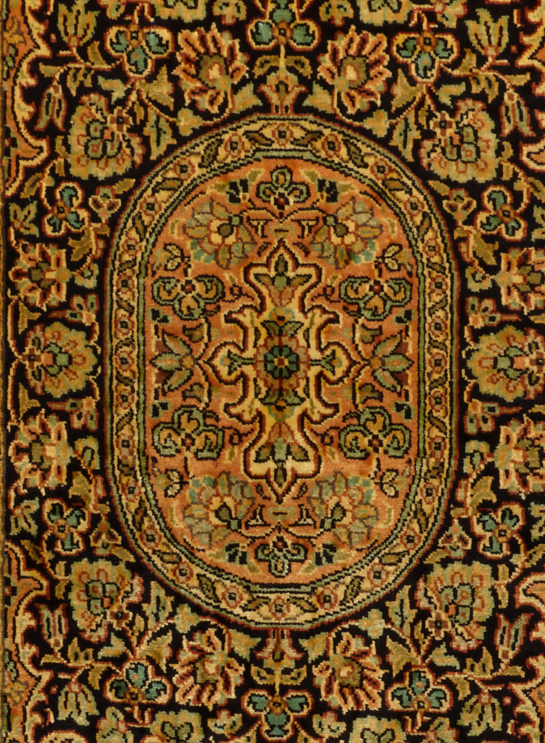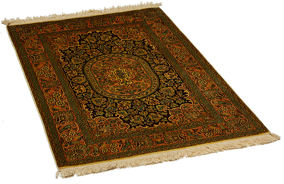 Ce dessin médaillon reprend les dessins traditionnels de la Perse on admira sur la bordure de belles fleurs ornées de petites feuilles, ainsi que sur le dessin central (le fond beige est en soie et les parties colorées sont en laine)