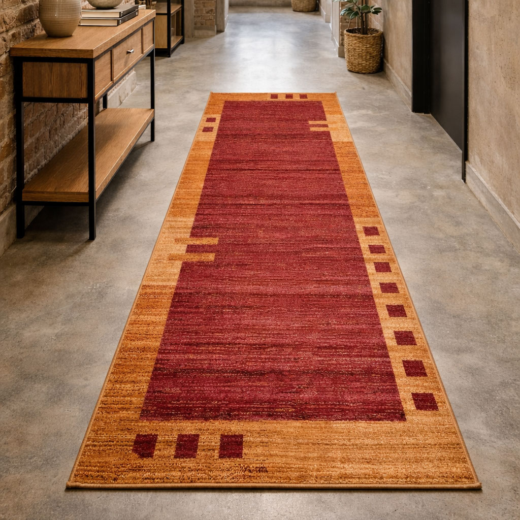 Tapis CHOBAY 1 rouge comporte des dimensions pour salon et couloir, fait machine.