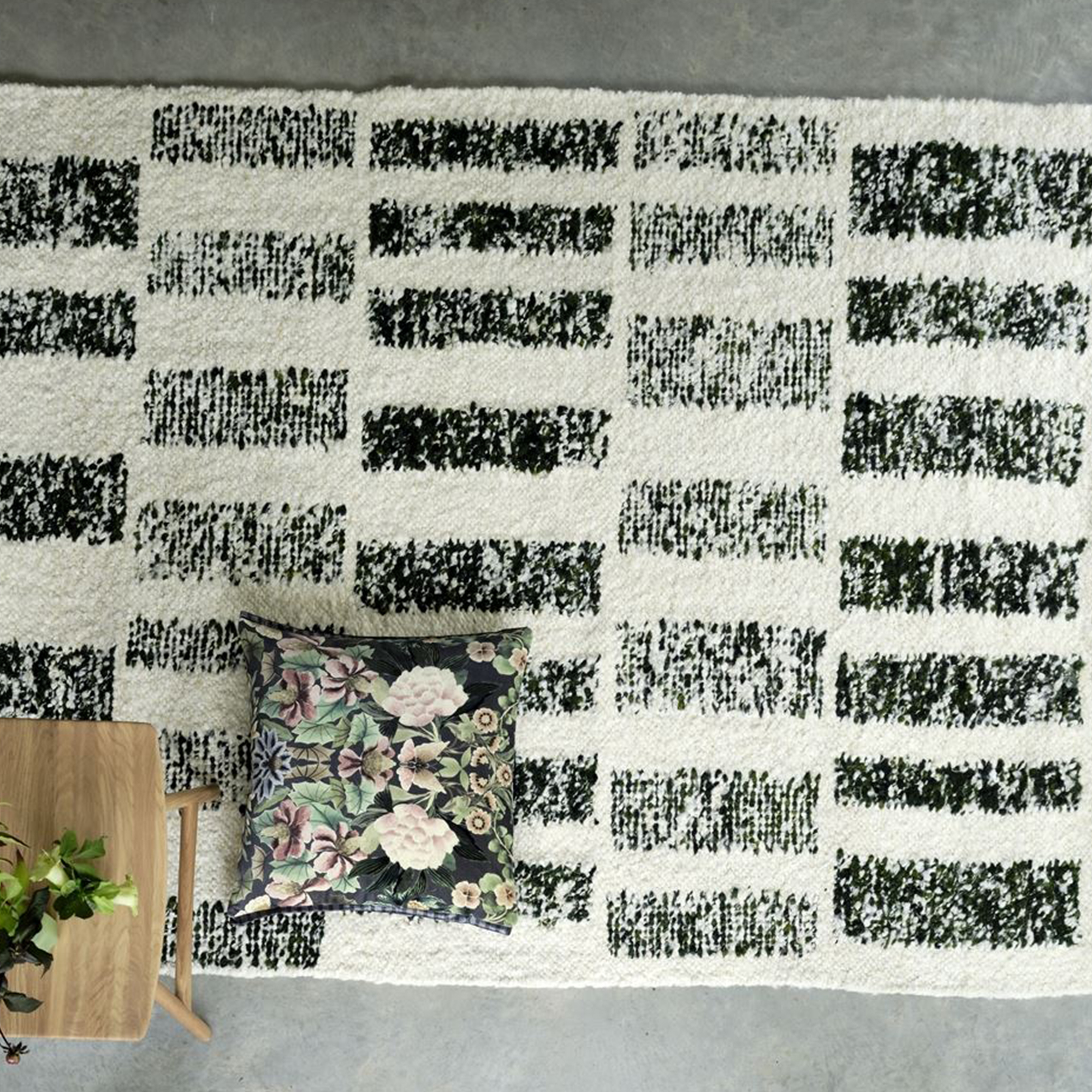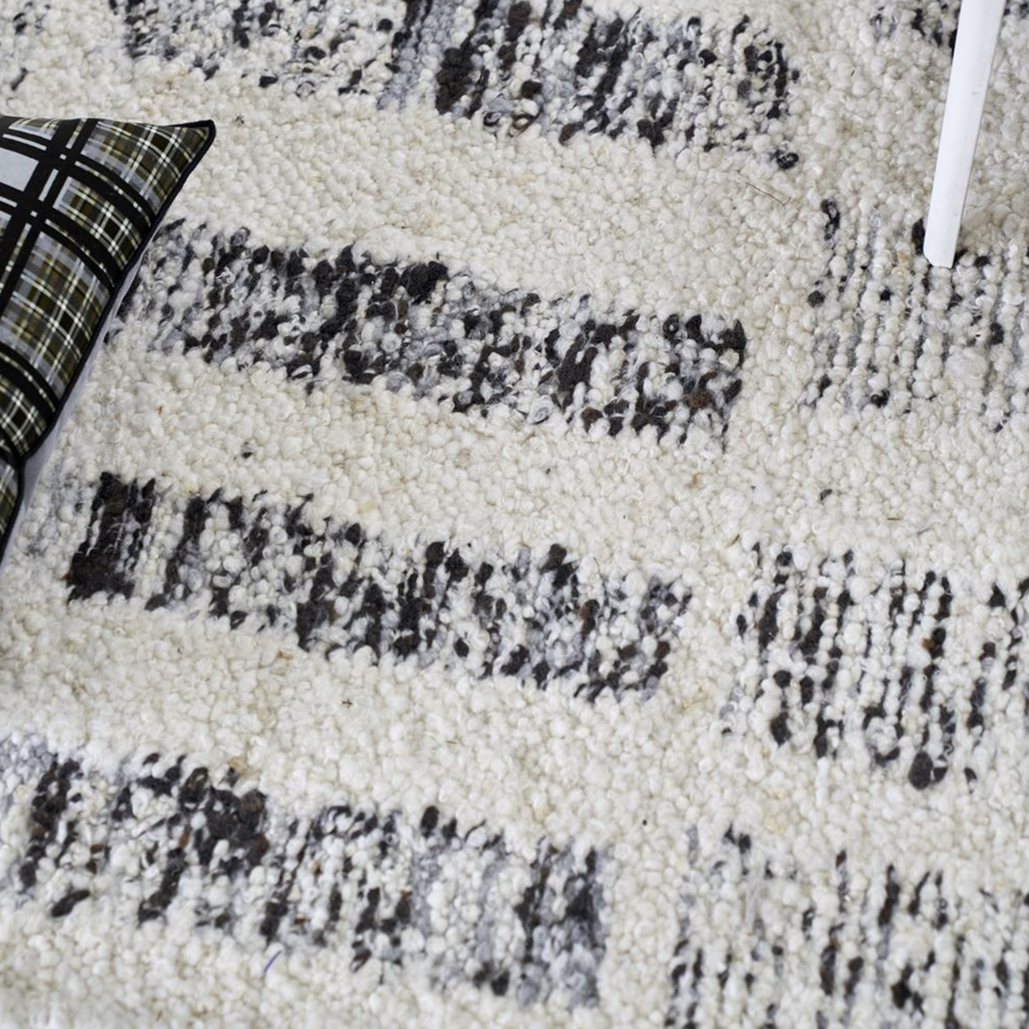 La nature irrégulière du fil de laine utilisé fait partie du caractère et du charme de ce tapis, la laine naturelle non teintée contraste avec des sections rectangulaires de fils verts dans le motif.