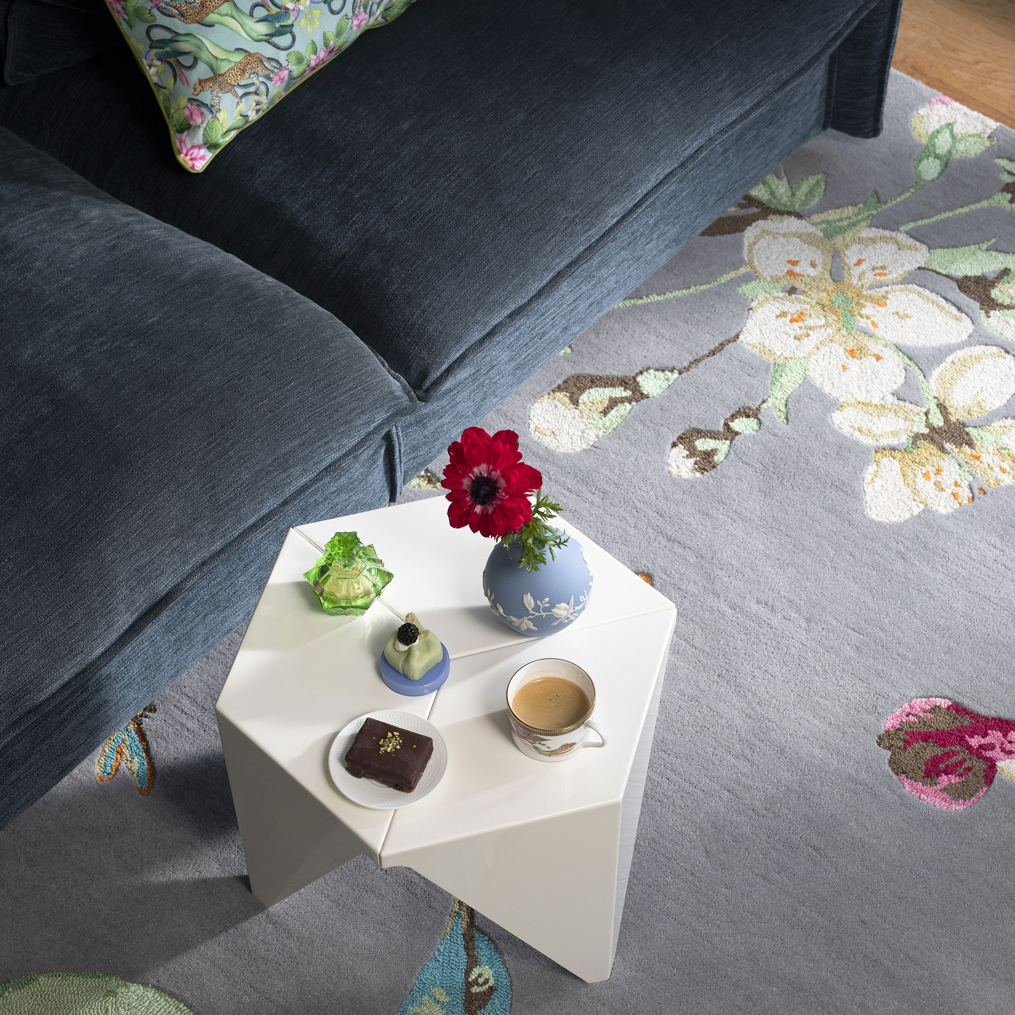 Elle propose aujourd'hui une superbe gamme de tapis tuftés à la main en laine inspirée par le riche héritage des motifs Wedgwood.