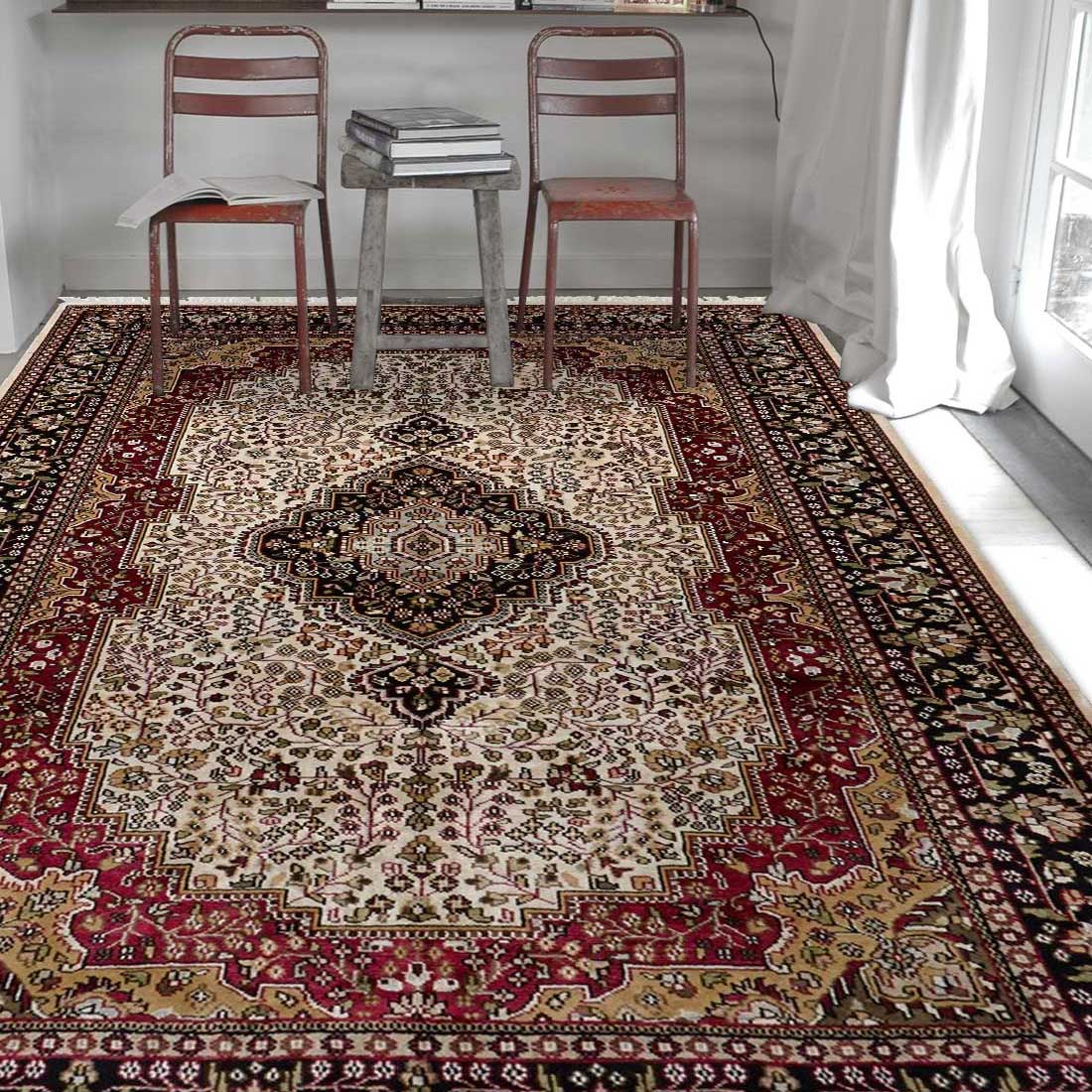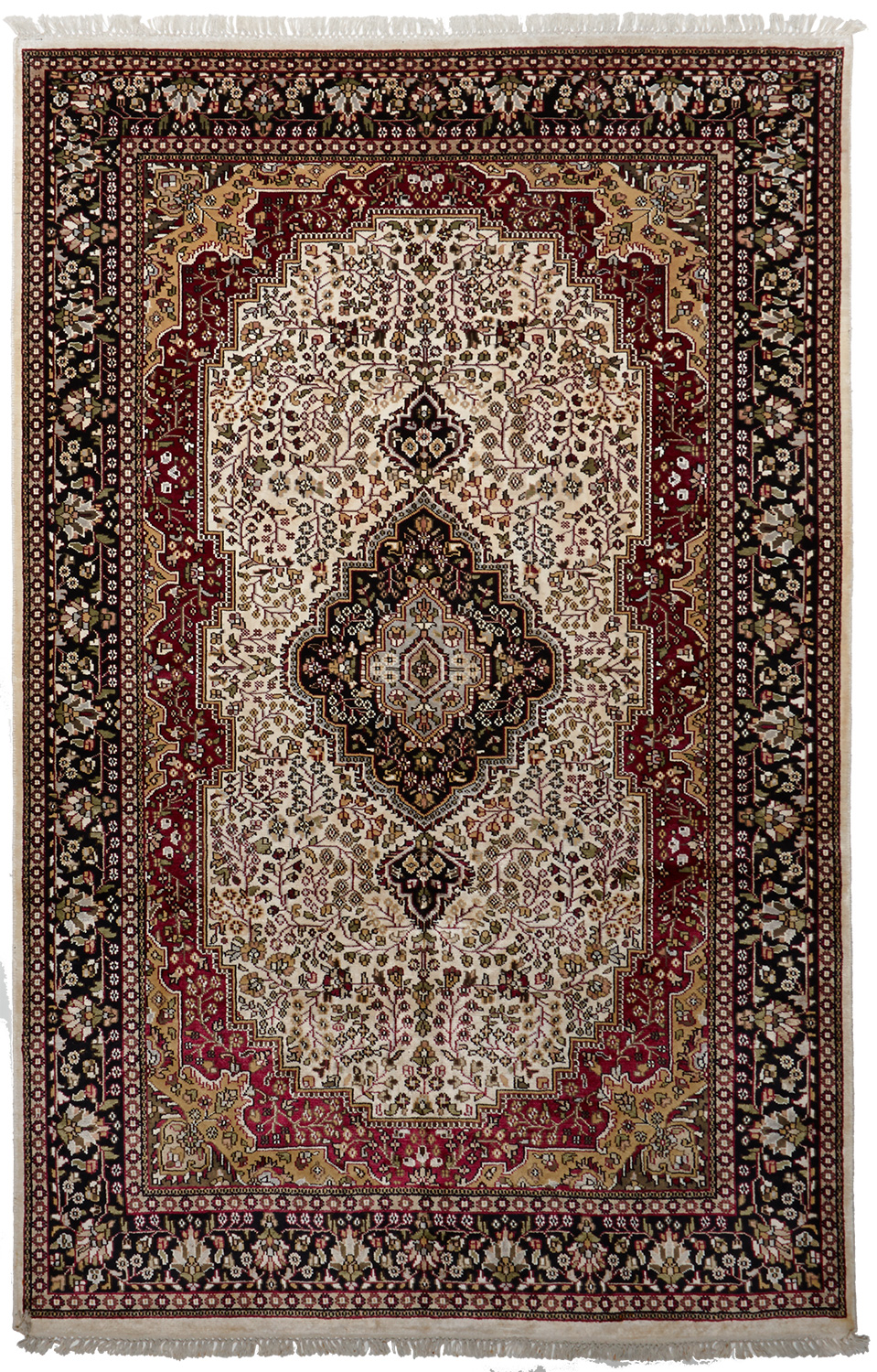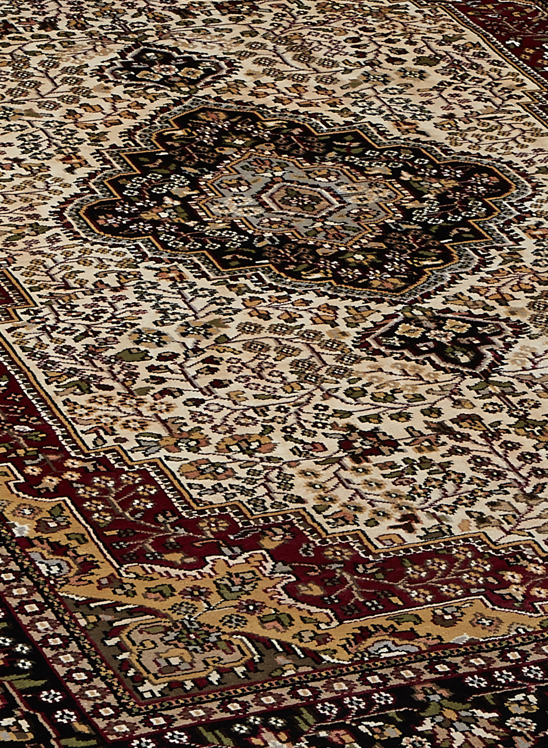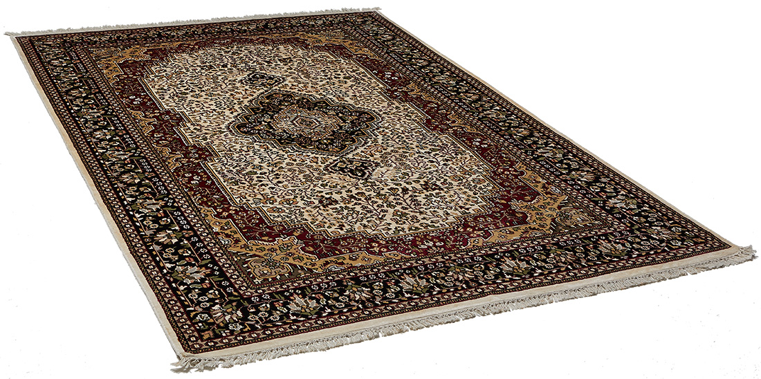 Ce dessin médaillon reprend les dessins traditionnels de la Perse on admira sur la bordure de belles fleurs ornées de petites feuilles, ainsi que sur le dessin central (le fond beige est en soie et les parties colorées sont en laine)