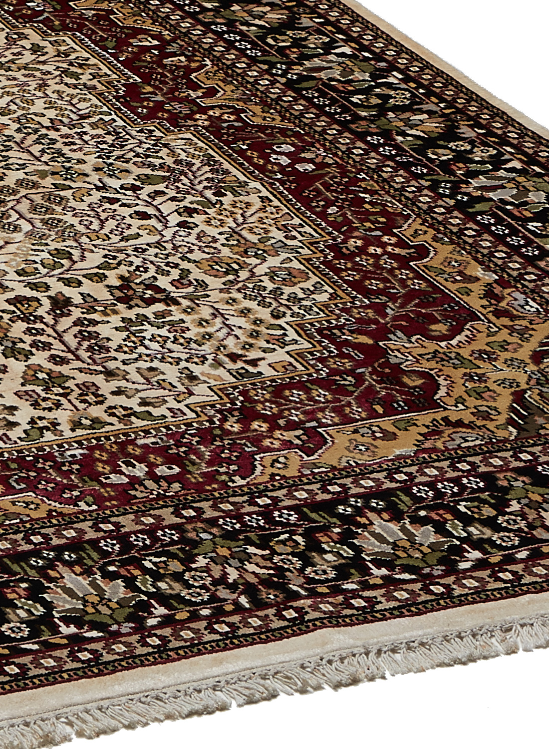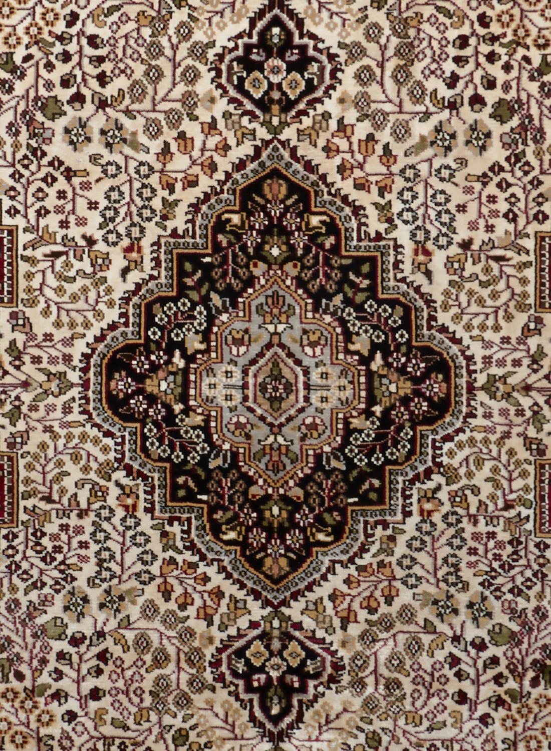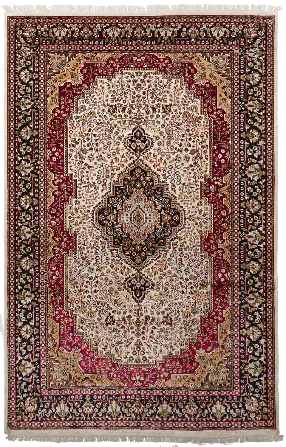 Ce dessin médaillon reprend les dessins traditionnels de la Perse on admira sur la bordure de belles fleurs ornées de petites feuilles, ainsi que sur le dessin central (le fond beige est en soie et les parties colorées sont en laine)