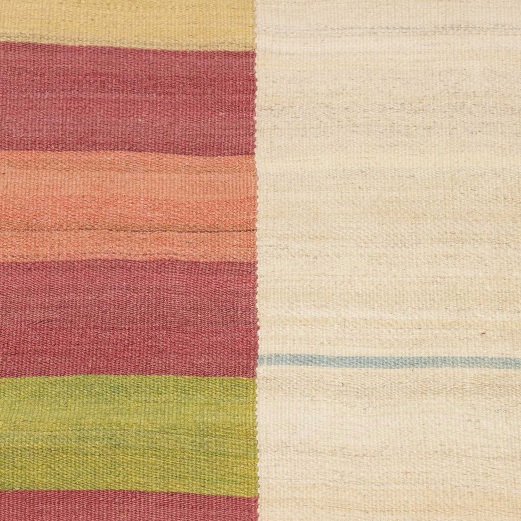 - Ce tapis est un tapis Kilim, c'est un tapis tissé à plat dont le velours est uniquement constitué de fils entrecroisés par la chaîne et la trame (il n'y a pas de brins poils, pas de hauteur de velours : c'est un tissage à plat)