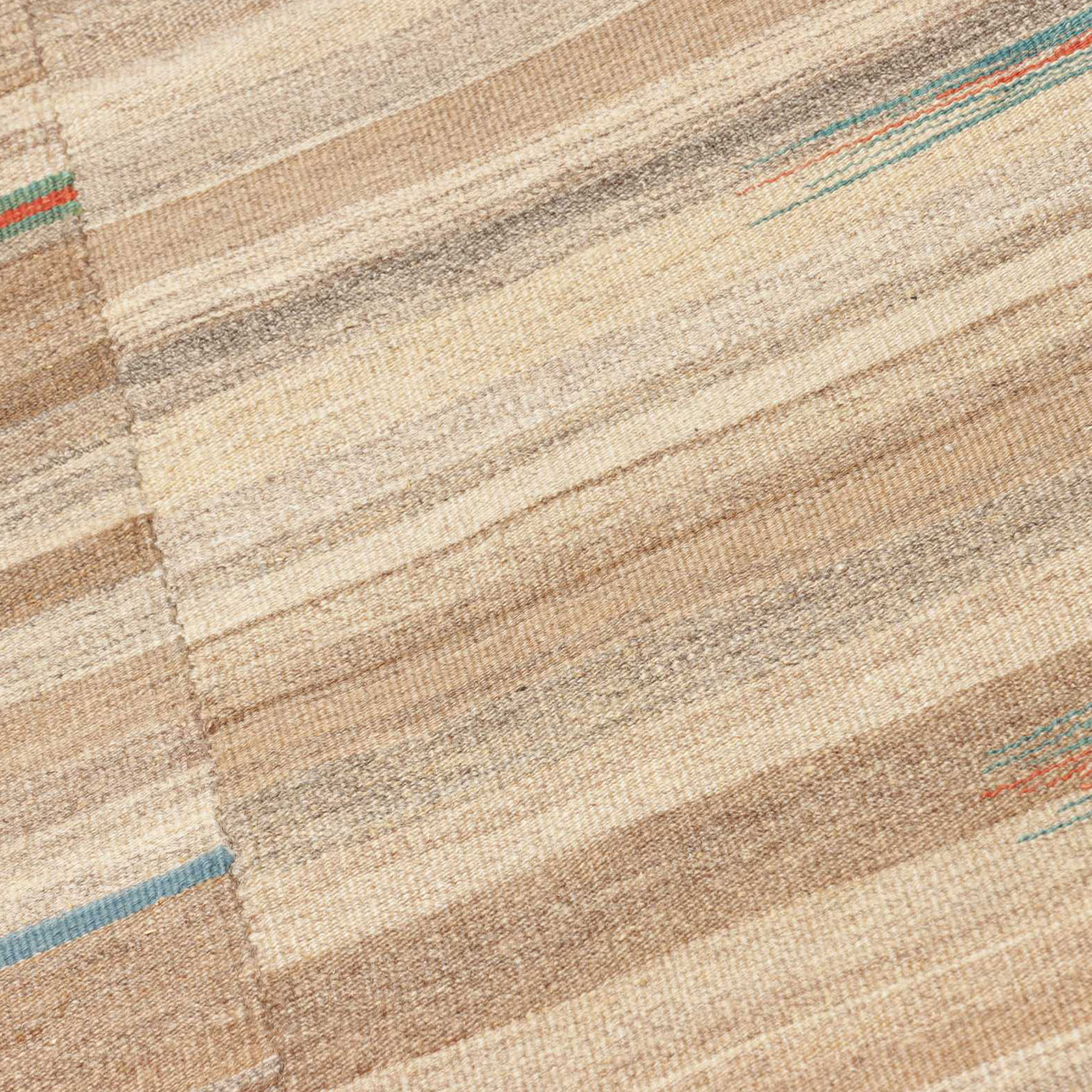 - Ce tapis est un tapis Kilim, c'est un tapis tissé à plat dont le velours est uniquement constitué de fils entrecroisés par la chaîne et la trame (il n'y a pas de brins poils, pas de hauteur de velours : c'est un tissage à plat)