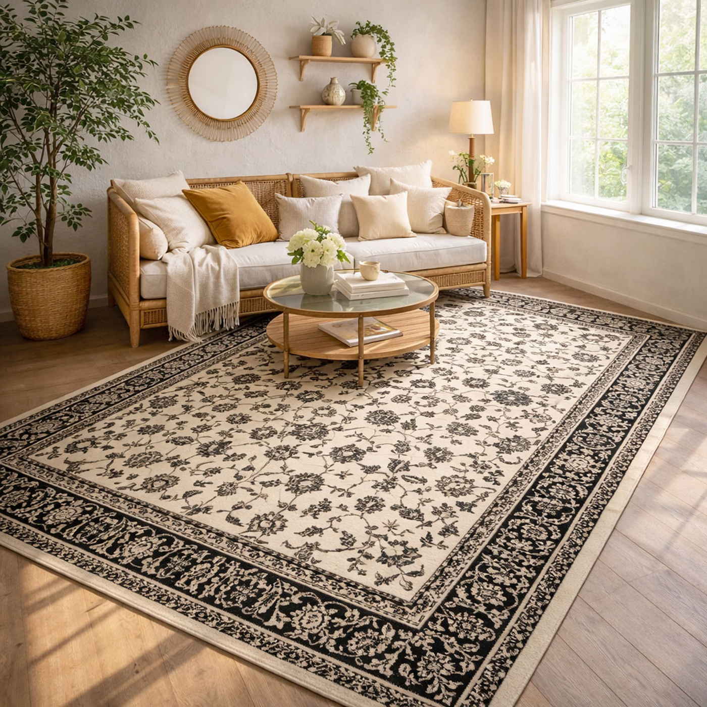 Ce modèle existe en plusieurs dimensions pour s'adapter à tous les espaces. Pour un salon, les pieds avant du canapé doivent reposer sur le tapis avec la table basse centrée dessus. Pour une chambre, le tapis doit dépasser le lit de 50 à 60 cm de chaque côté. En cas d'hésitation entre deux tailles, choisissez toujours la plus grande — un tapis trop petit est l'erreur décorative la plus courante.