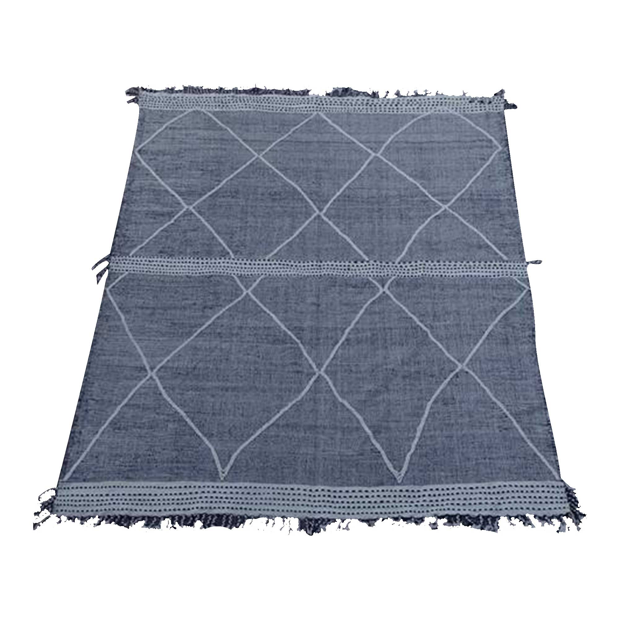 - Ce tapis est un tapis Kilim, c'est un tapis tissé à plat dont le velours est uniquement constitué de fils entrecroisés par la chaîne et la trame (il n'y a pas de brins poils, pas de hauteur de velours : c'est un tissage à plat)