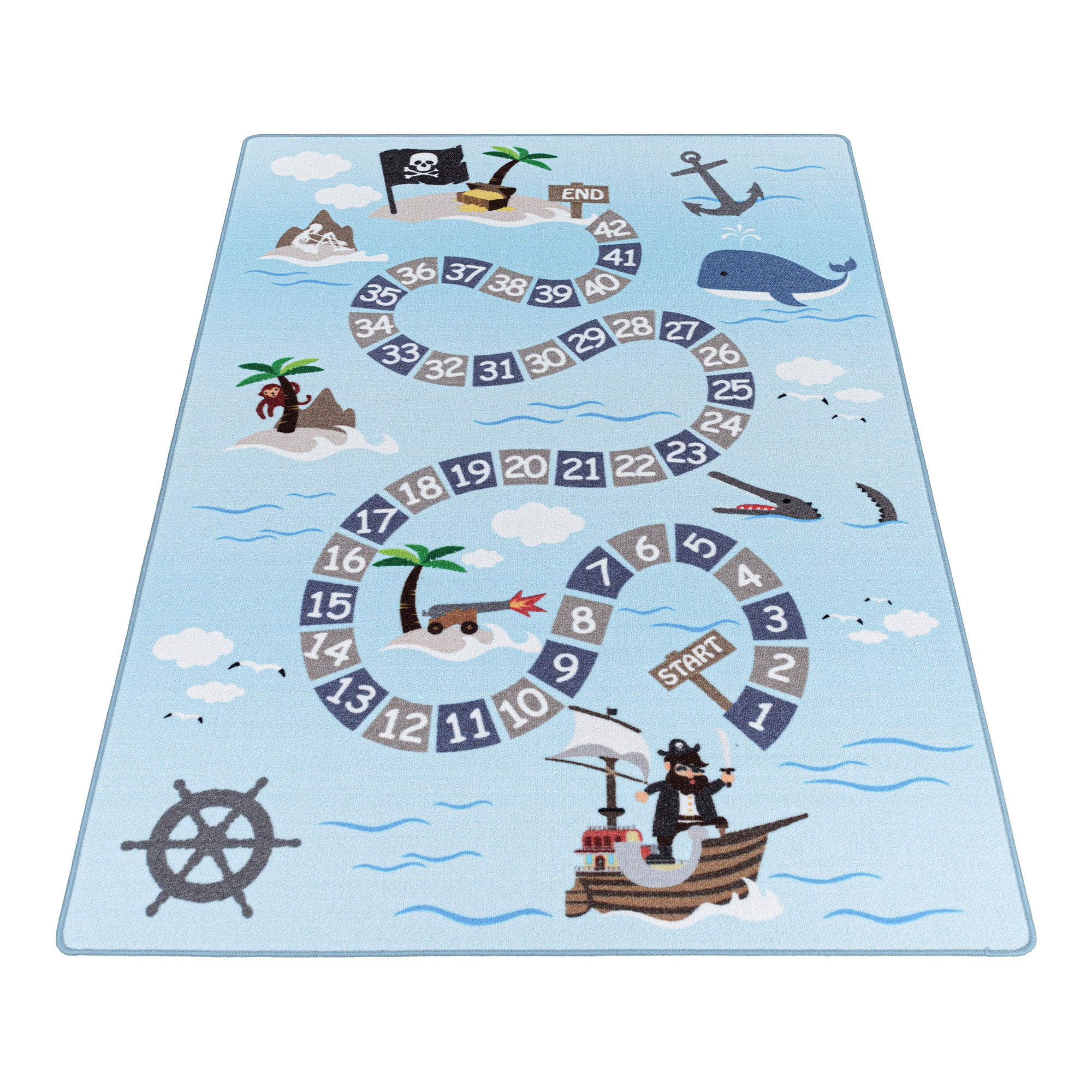 Comme une chasse aux trésors en pleine mer, votre enfant va créer tout un imaginaire grâce à ce tapis aux ton doux et apaisants. Il va découvrir et appprendre les chiffres en s'amusant, chaque case l'ammenant toujours plus proche de l'ïle mystérieuse !