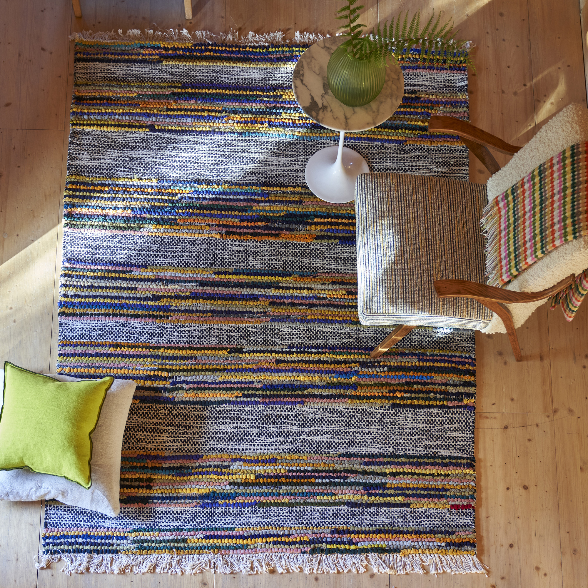 Ce tapis artisanal ZANSHI de la collection DESIGNERS GUILD est tissé à partir de restes de tissus et de tissus recyclés, créant ainsi un produit vraiment unique.